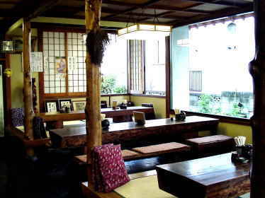 丸太のテーブルが、落ち着いた雰囲気を漂わせ、